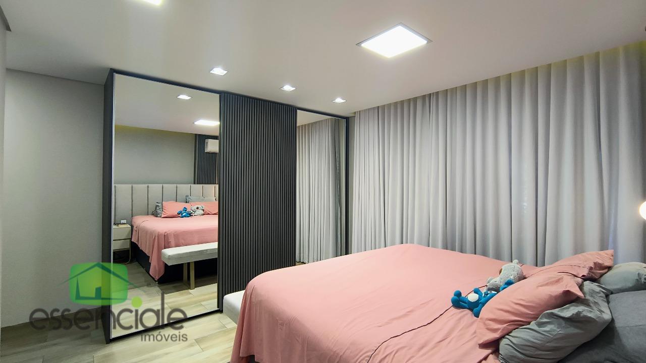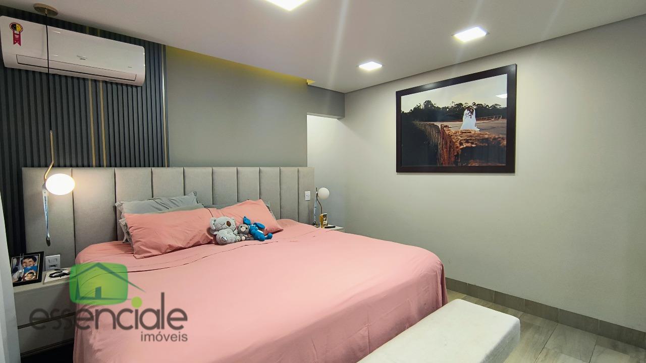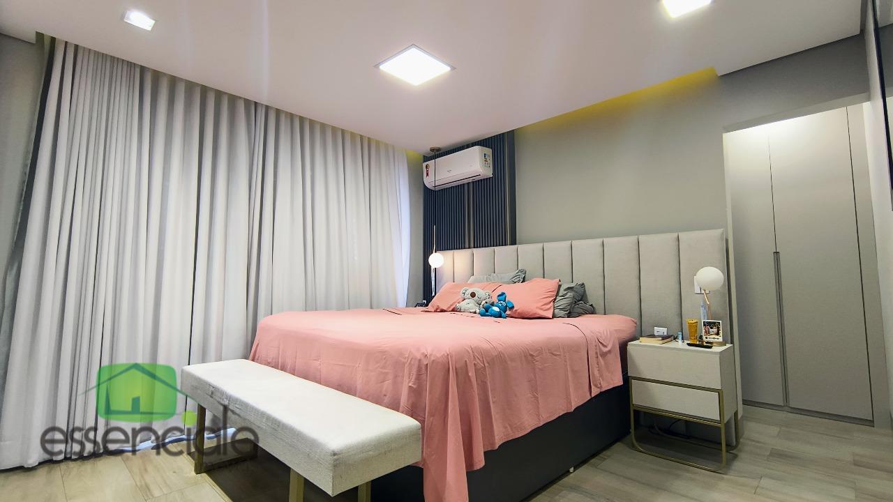 Três quartos, sendo um suíte com armário e roupeiro planejados, painel da cama com armários de cabeceira, pré disposição para ar condicionado, banho com armário, espelho, nicho e box, acabamento em porcelanato.