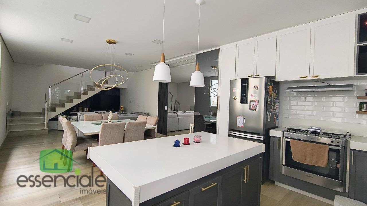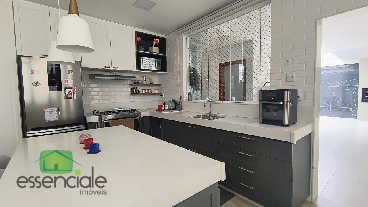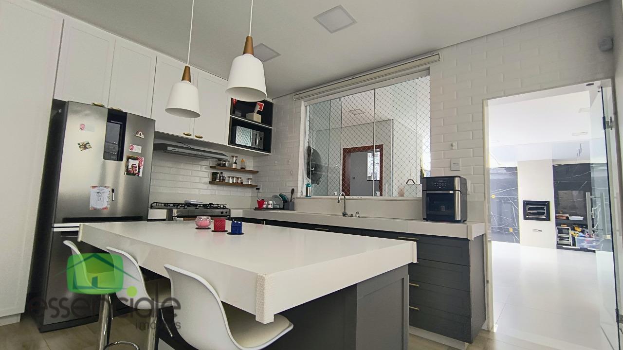 Cozinha com ilha e bancadas em quartzo branco, armários planejados, cristaleira.