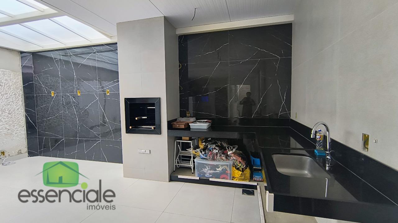 Área gourmet com bancadas em granito, churrasqueira, teto retrátil, ducha e lavabo.